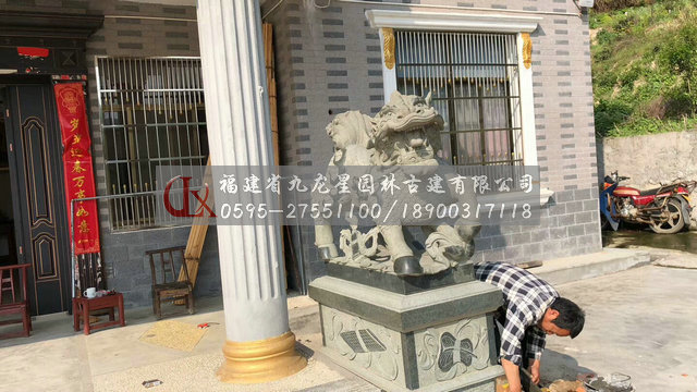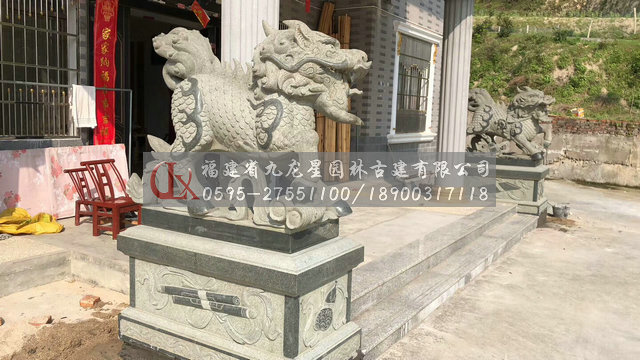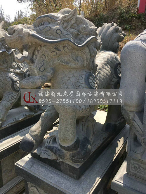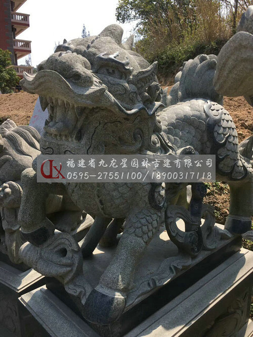 麒麟造型中石刻麒麟多在建筑、皇家建筑里出現(xiàn),其體型巨大,多以威武雄健之態(tài)出現(xiàn)。這說明,麒麟造型的比例尺寸大小是與特定的環(huán)境、風(fēng)俗、情感相聯(lián)系的。石雕麒麟的大也可以解釋為大氣、圣威、權(quán)利,具有震懾的作用。石雕麒麟的造型遵循著傳統(tǒng)文化審美的習(xí)慣,麒麟的造型特征說明其造物意象充滿了對美好與吉祥的期望。石雕麒麟的整個(gè)造型集龍頭、鹿角、獅眼、虎背、熊腰、蛇鱗、馬蹄、豬尾于一身,另外使用添加手法在下頜處加有長長的胡須,又添加翅膀,這樣,麒麟可以奔跑,可以飛翔,威武之勢讓人可望不可及。麒麟體現(xiàn)了古人對現(xiàn)實(shí)世界的主觀理想與造物的主動性,其和龍、鳳一樣成了我國傳統(tǒng)民族精神的象征。還有,石雕麒麟的擺放一般是成雙成對出現(xiàn)的,主要因?yàn)槠湓煨椭v究碩大豐滿,還注重陰陽相守,忌諱殘缺不全、形單影只,其中寄托了人們“天人和諧”的精神追求,內(nèi)涵獨(dú)特而豐富。