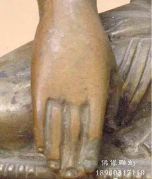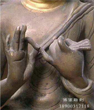 佛像的各種手勢(shì)代表佛像的不同身份,表示佛教的各種教義,是具有印度特點(diǎn)的人體語(yǔ)言,表達(dá)的含義極為豐富。常見(jiàn)的有說(shuō)法印、無(wú)畏印、與愿印、降魔印、禪定印5種,即“釋迦五印”。手印形式可有多種變化,尤其是密教手印多達(dá)幾百種,變化莫測(cè),見(jiàn)的有智拳印、期克印等。