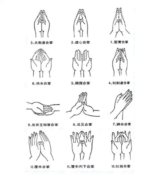 十二合掌分別是堅(jiān)實(shí)心合掌、虛心合掌、未敷蓮合掌、初割蓮合掌、顯露合掌、持水合掌、歸命合掌、反叉合掌、反脊互相著合掌、橫柱指合掌、覆手向下合掌、覆手合掌。