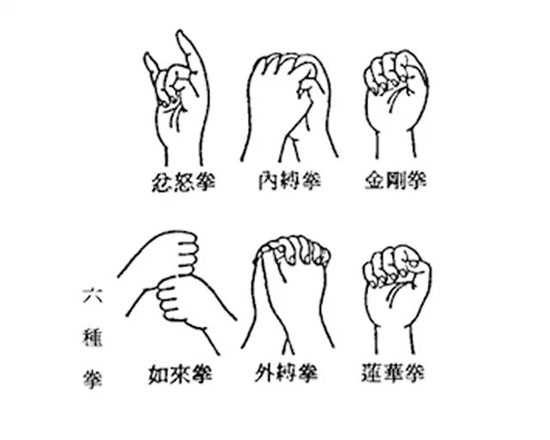 六拳包括金剛?cè)⑸徣A拳、內(nèi)縛拳、外縛拳、如來(lái)拳、忿怒拳。