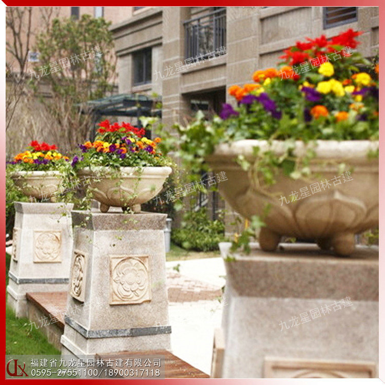 福建石材花缽批發(fā)-九龍星園林古建。石材花缽靈活多樣,隨處可用,尤其對于城鄉(xiāng)建筑比較密集和其他一些難于綠化地區(qū)的美化,有著特殊的意義。石材花缽的擺放可根據(jù)缽、盆樣式、大小的不同,進行多種多樣的藝術(shù)組合。組合的形式可以是幾何式、自然式、混合式、集中布置、散置等,具體布局形式可根據(jù)要美化地點的情況決定。在較寬敞的地方,如廠前區(qū)、廣場、大型建筑門前、道路交叉口、停車場等處,石材花缽可布置為樣式多變、五彩繽紛的小花壇,在商店、住宅的門前亦可隨機點綴一二。