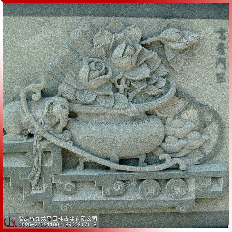 常見傳統(tǒng)寓意浮雕紋樣內(nèi)容有:花開富貴、喜鵲報(bào)喜、丹鳳朝陽、太平有象、鹿竹同春、麒麟獻(xiàn)瑞、麒麟送子、松鶴延年、壽比南山、八仙祝壽、紫氣東來、五福臨門、招財(cái)進(jìn)寶、吉慶有余、五谷豐登、龍鳳呈祥、平安如意、歲歲平安、年年有余等生活風(fēng)俗或神話故事中富有美好寓意的吉祥圖案。